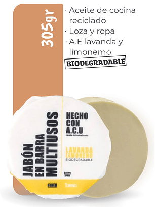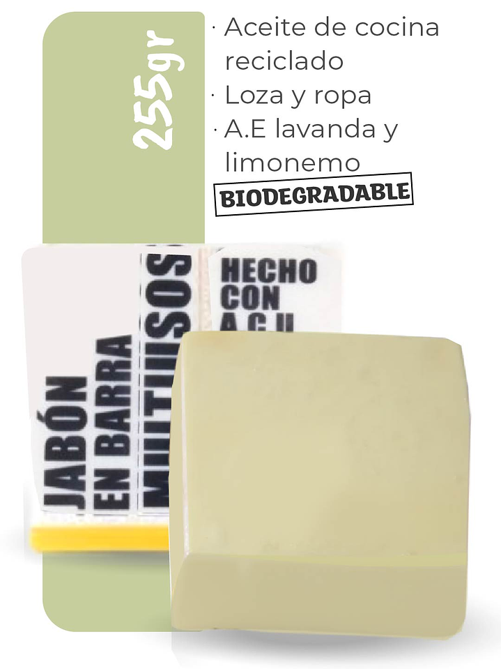 COMPONENTES: Mezcla de aceites y grasas recicladas saponificadas, aceites esenciales (limoneno y lavanda).